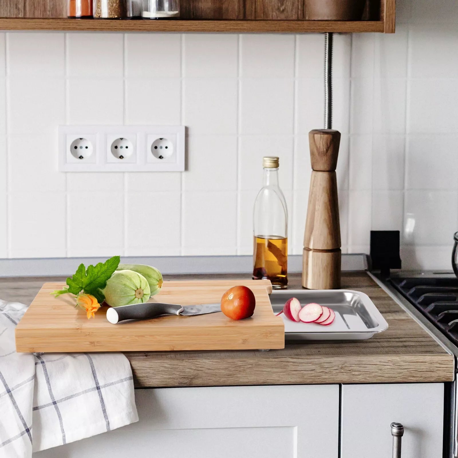 Have you ever felt like your kitchen space is running out when you're cooking? Our cutting board makes it easier to organize your work.