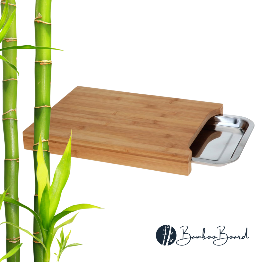 Give your kitchen an upgrade with our smart bamboo cutting board with integrated steel tray!